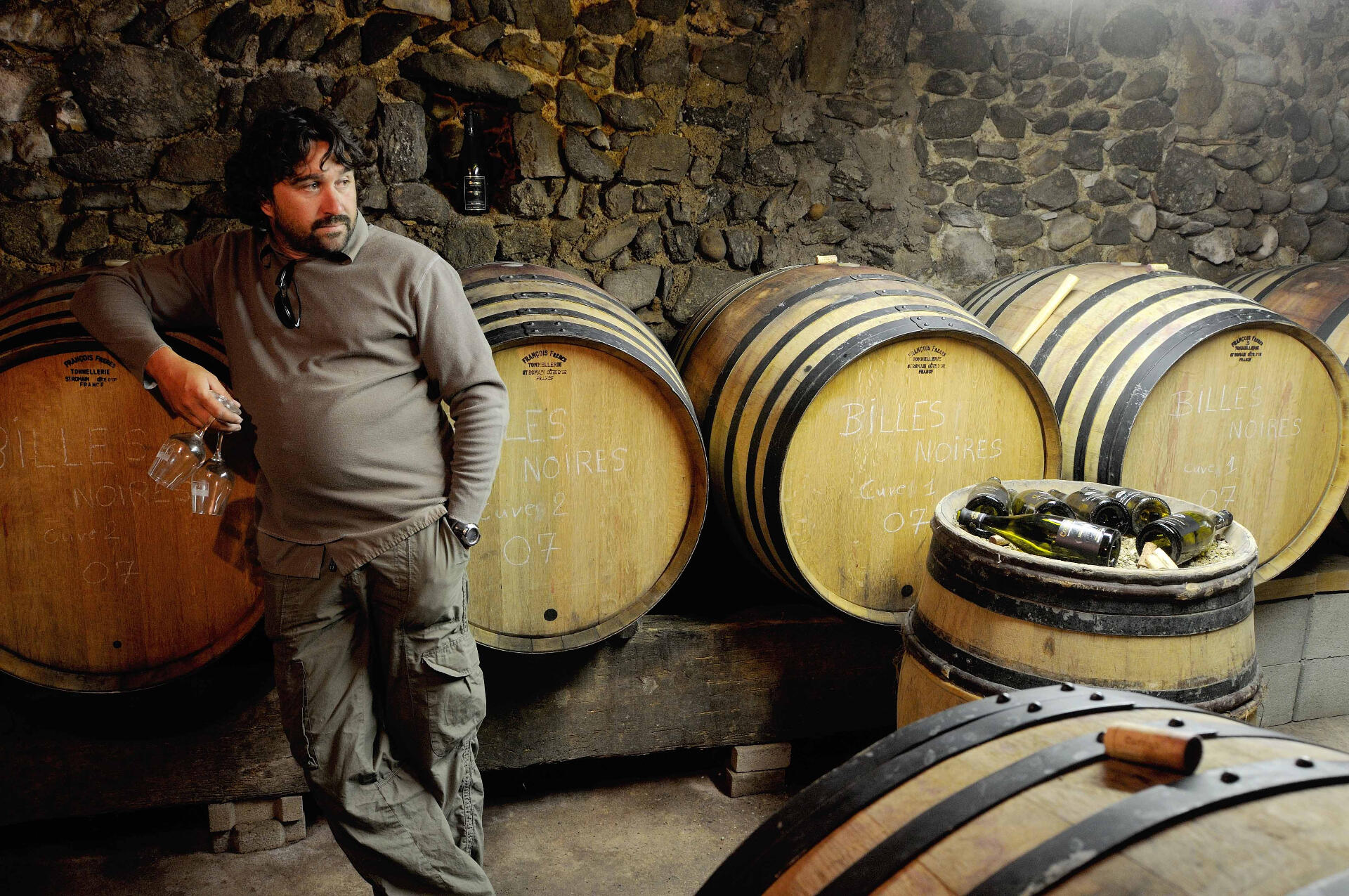 Apprenticed with grandfather’s agriculture and truffle affairs since 2nd grade.With his wife Sylvie Augereau, creator of La Dive, he’s our Vincent Van Gogh of vin natural.Nicolas Reau’s love of wine started when he was eight years old and his grandfather was sneaking him small glasses of red wine while his grandmother had her back turned. Young Nicolas went on to train to be a professional pianist and didn’t consider wine as a potential career path. He thought it was impossible to become a producer if you do not come from a vigneron family. However in 1994, Nicolas saw an advertisement in the school newspaper about a professional degree in viticulture and oenology and he decided to step away from his piano to finally begin an adventure in wine.In 1998 Nicolas Reau took over an estate of 28 ha. In 2001—after three years of analysis, observation and putting his education into action—Nicolas decided to get rid of 23 hectares and only kept five of the best hectares surrounded by a wall. Those five hectares represent the Clos des Treilles (his DBA name). Two additional hectares were replanted bringing the total area to 7 hectares. In 2002 Nicolas made his first vintage, with natural yeast and minimal intervention from the start.In 2005 Nicolas met someone who changed his future: Sylvie Augereau, the Famous French wine writer and the future herald of natural wines. Today Augereau is the organizer of La Dive Bouteille and is also Nicolas’ wife. Nicolas Reau was quickly welcomed into this growing network of natural wine pioneers (including Marcel Lapierre, Yvon Métras, JF Ganevat, etc.) and so began the latest movement in French natural wine. In 2007 he carried out his first vintage “sans soufre”, the first of a long series.Nicolas practices Biodynamics but doesn’t seek the certification. Instead his philosophy is to be guided by conscientious farming so as to produce wines that are clean, distinct and honest. To this end, Reau uses intuition to identify the 2 to 3 day window where the fruit shows phenolic maturity but still has a low potential alcohol. This window is identifiable when the fruit demonstrates the most harmony on the palate, a sensation that is almost impossible to find in vineyards manipulated by chemicals and industrial processes according to Reau. He believes that if you let the climate and vines guide the work in the vineyard, the energy of the fruit will carry through to the finished wine as long as the winemaker refrains from similar interventions in the cellar. With slight variations in ripeness of the individual berries at harvest, Reau’s wines carry a natural acidity, freshness, and personality that cannot be reproduced by any other means.